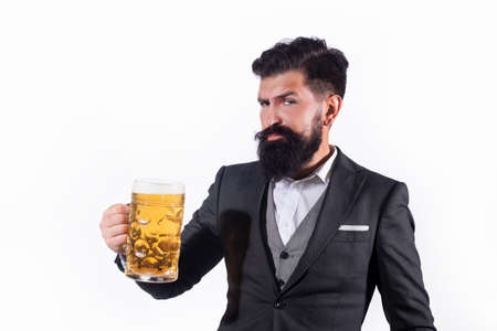 Bearded man holding a glass of beer. Hipster with beard and mustache in suit drinks beer after working day.