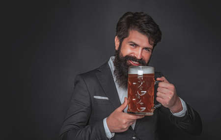 Man with beard drink beer. Retro man in black suit with a beer. Bearded man drinking lager beer. Brewery concept.
