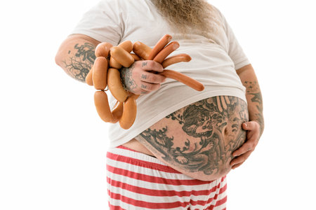 Emotional fat funny and tattooed man with food isolated on a white background