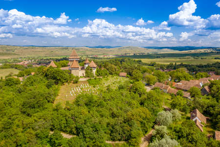 Aerial view of site Biertan fortified saxon church and village in Romania