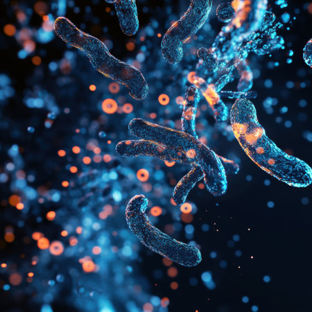Vivid visualization reveals diverse microbes suspended in a dark, bioluminescent atmosphere, highlighting their intricate structures and interactions.