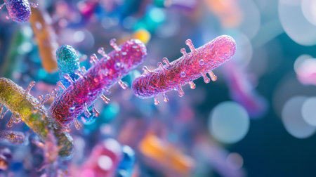 Colorful microscopic bacteria close-up with vibrant textures. Scientific and medical concept