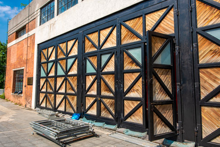 Front view of gray staff room door and air pipelines with sunlight and shadow on grey cement wall surface