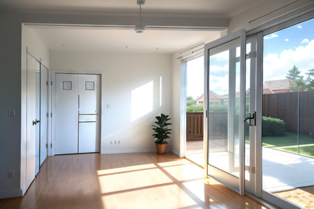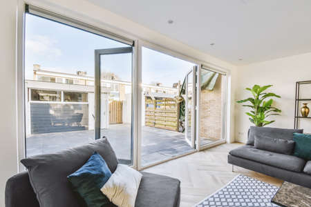 Experience the allure of modern living with this bright interior view. Sunlight streams through large glass doors, illuminating a luxurious living room and connecting it to a sunny balcony. This architectural design showcases a contemporary home, ideal for visualizing real estate, interior design projects, or lifestyle content. The open space, minimalist aesthetic, and abundance of natural light create a serene and elegant atmosphere perfect for modern living.