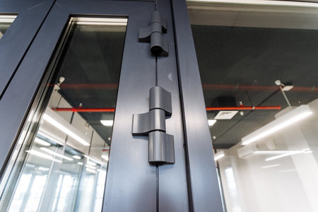 The image shows a closeup of metal hinges, highlighting their intricate mechanism and advanced engineering concepts, suitable for industrial, manufacturing, and hardware applications