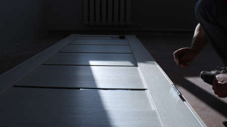 the process of marking the distance of fasteners on a light sheet of a wooden door lying on the floor, the carpenter calculates the position of the door sheds by sitting down next to the door