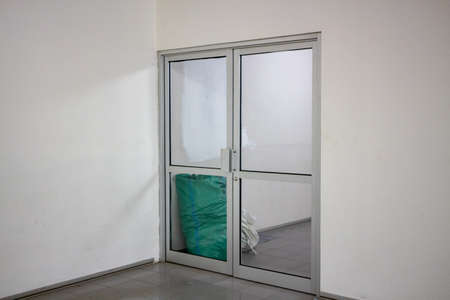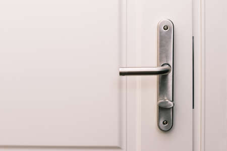 White door and handle. Entrance to an apartment, office, or bedroom. Door detail. Interior of a house or hotel.