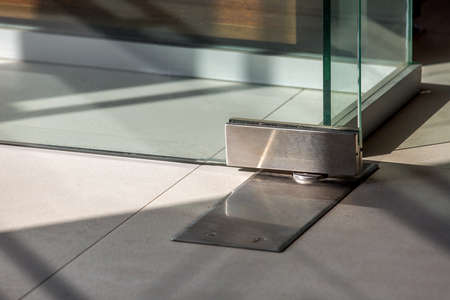 Glass door fittings, swivel mechanism holding the door metal loop on the tile floor lit by sun light close up.