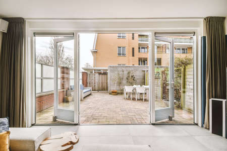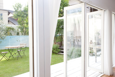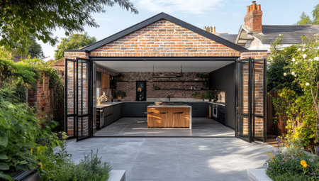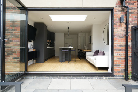 Patio and lush summer garden seen from a stylish interior through open bifold doors, creating a seamless transition from inside to outside