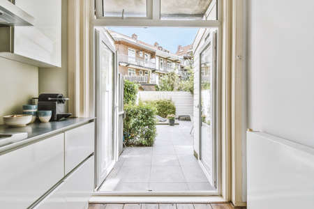 Interior of a modern house with open black frame glass door showing a beautiful green garden with trees, plants and stones