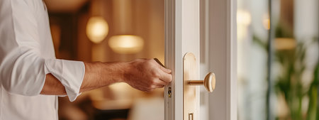 A person opening a modern door in a stylish indoor setting with soft lighting and decorative elements