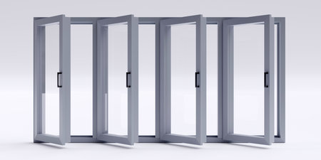 Four window PVC plastic grey framed opened isolated cutout on empty white background. Copy space. Home, office interior ad template. 3d render