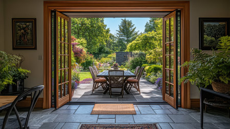 Beautiful view of sunlit garden through open French doors, showcasing serene outdoor space with wooden chairs and lush greenery. warm sunlight creates peaceful atmosphere