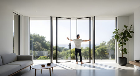 A man stands in a modern, minimalist living room pushing open large glass patio doors to reveal a stunning view of trees and the ocean. The image symbolizes freedom, a fresh start, and the enjoyment of a luxurious home environment.