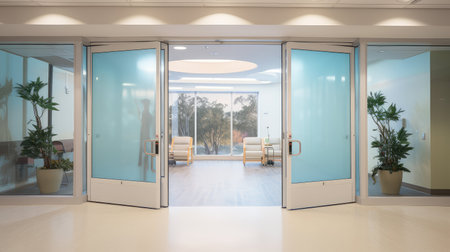 Modern Office Entrance, Glass Doors, Blurred Bokeh Background, Night Time Cityscape Reflection