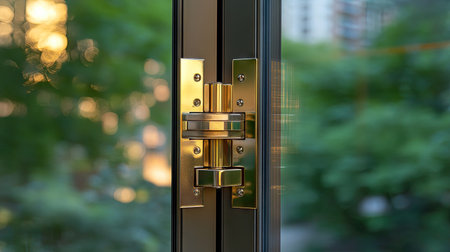 Detail of an aluminum window hinge, focusing on the metallic texture and the mechanical design, with a blurred outdoor landscape in the background. --chaos