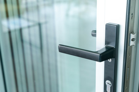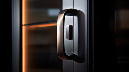 A detailed closeup of a metal door handle on a glass door, showcasing fine craftsmanship and sleek design elements
