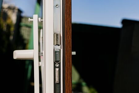 The Intricate Beauty of a Newly Installed Double Glazed Kitchen Door: A Close-Up on the Metal Locking Bolt, Revealing the Gateway to a Serene Patio in an Enclosed Garden