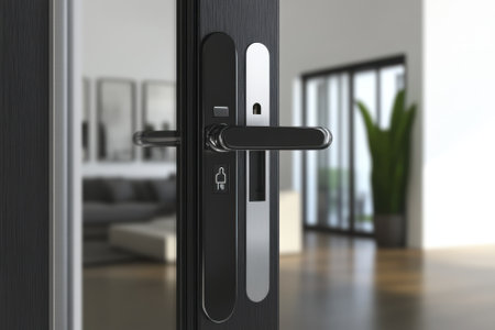 A sleek door handle is shown, highlighting modern design in an elegantly furnished living room.
