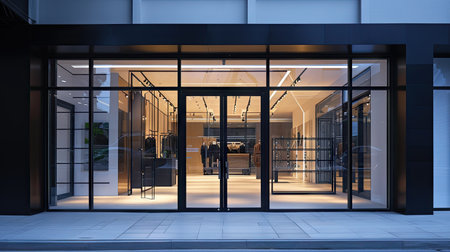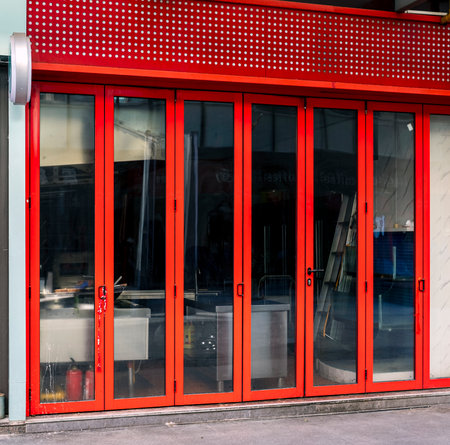 An exterior daytime view presents a cafe with a wooden door, surrounded by large glass windows. The building features visible business signage above the entrance. The composition and lighting suggest a welcoming atmosphere, suitable for various commercial uses. The scene could be utilized for editorial content or advertising purposes.