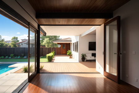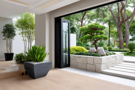 Interior of a modern house with open black frame glass door showing a beautiful green garden with trees, plants and stones