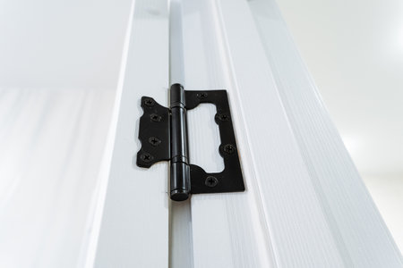 This image features a detailed closeup representation of a black door hinged that is attached to a white door, highlighting its texture and design