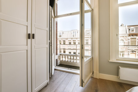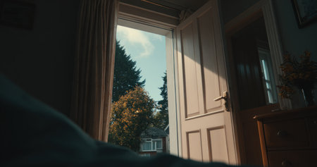 Interior bedroom with an open door reveals a sunny outdoor scene. Light streams in