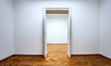 Open doorway framing view into a second, empty room with wooden floor, bright walls