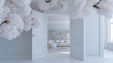 Spring flowers bloom as they hang above an open door, inviting people into a bright room filled with books and cozy seating for all