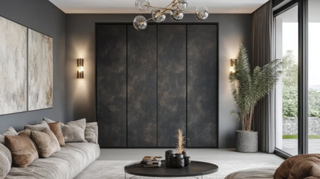This modern living room features stylish decor with a chic color palette, soft textures, and ample natural light. The minimalist design creates an inviting atmosphere perfect for relaxation and aesthetic appreciation.