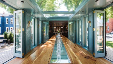 A contemporary interior space features a long wooden table extending through the center. Large glass walls and ceiling panels allow abundant natural light, creating a bright atmosphere. The design incorporates a muted blue color palette and minimalist aesthetic, potentially suitable for editorial and commercial applications.