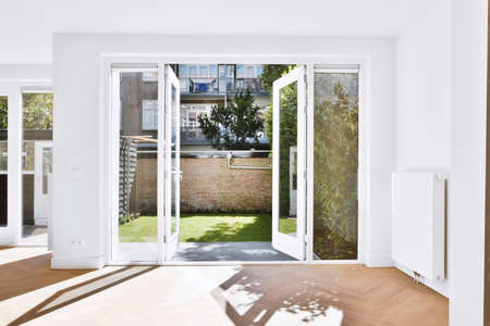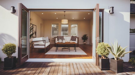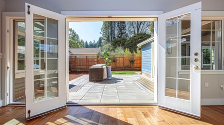 Beautiful view of sunlit garden through open French doors, showcasing serene outdoor space with wooden chairs and lush greenery. warm sunlight creates peaceful atmosphere