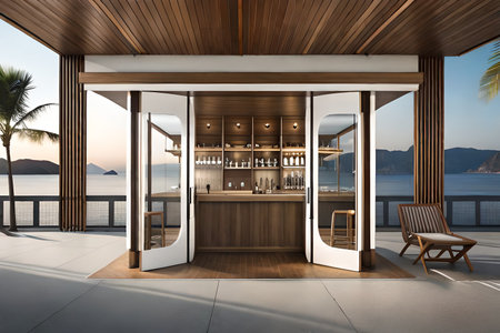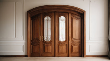 A stunning interior scene featuring sunlight pouring through beautifully crafted wooden doors. The warm tones and elegant design create an inviting and tranquil atmosphere.