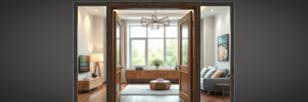 A stylish wooden doorway enhances a modern home's aesthetic with minimalist decor and inviting warmth.