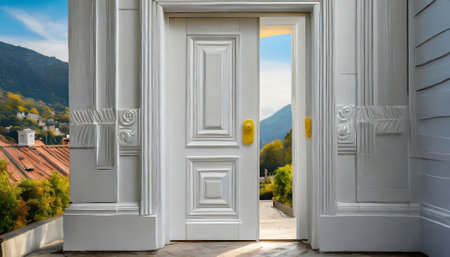 Open door emitting light possibilities growth achievements concept motivation learning skills knowledge heaven doors exit abstract simple background new ways entering leaving space imagination