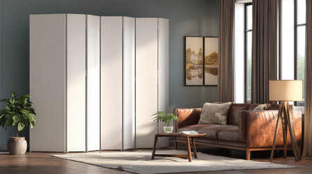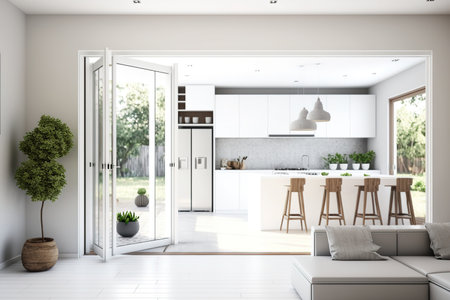Modern living room and kitchen with white folding doors, white interior design, architect designer concept, illustration
