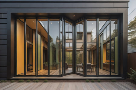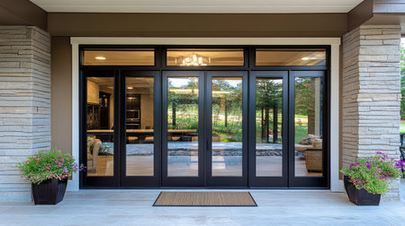 This image showcases a sleek modern entrance with expansive black framed sliding doors, surrounded by lush greenery and stone details, perfect for home inspiration.