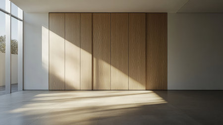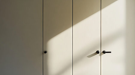 This image showcases a minimalist interior featuring three closed doors bathed in soft natural light, creating a serene and elegant atmosphere.