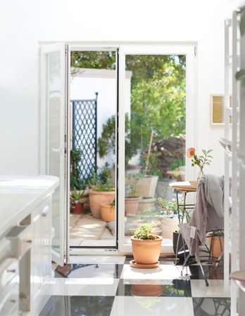 Home sweet home. Shot of a sliding door leading out to a yard.