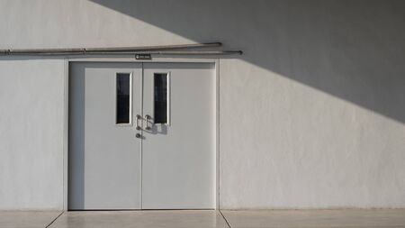 Front view of gray staff room door and air pipelines with sunlight and shadow on grey cement wall surface