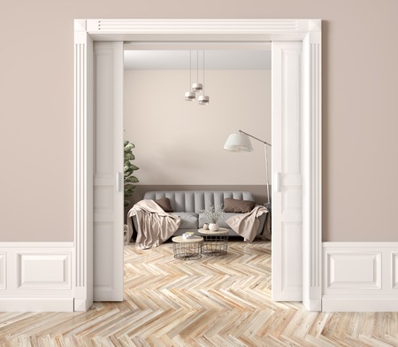 Grey sofa in living room behind the opened classic white sliding doors, interior of modern apartment. 3d rendering