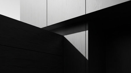 A striking abstract composition featuring dark and light wood panels arranged in a minimalist, geometric Sharp, defined shadows are cast across the surfaces, creating a dramatic interplay of light and dark. The wood grain is visible, adding subtle texture to the clean lines and shapes. The overall aesthetic is modern, and stark, emphasizing contrast and form. is backgrounds, or as a representation of contemporary interior architecture.