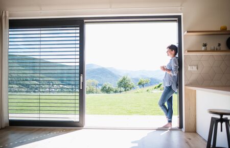 Side view of young woman with coffee standing by patio door at home.