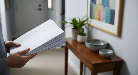 A person stands in a home hallway holding a stack of white envelopes and papers. The scene suggests receiving mail, organizing paperwork, or sorting through bills in a domestic setting.