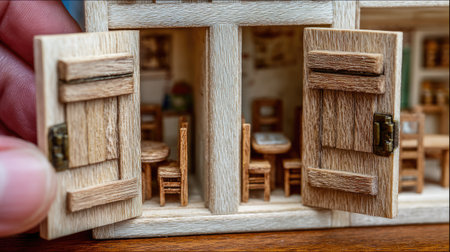 This image showcases a beautifully crafted miniature house interior featuring open wooden doors. The scene reveals detailed furniture, creating a cozy and inviting atmosphere.