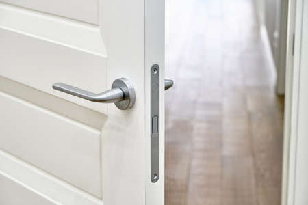 Stylish white inner open door with silver handle to room with elegant oak parquet flooring as contemporary interior close view