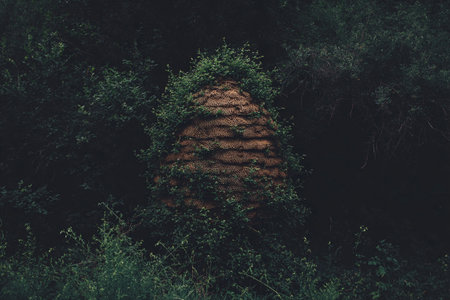 A beehive covered in greenery sits peacefully in a forest during the afternoon light.