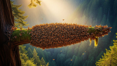 Large swarm of bees working on a honeycomb attached to a tree branch, creating honey