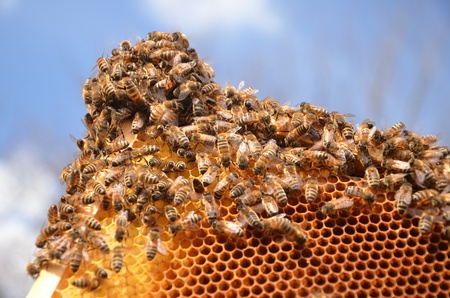 Thousands of bees on honeycombs with honey. Bees collecting nectar and putting into hexagonal cells after returning to beehive