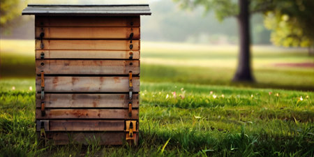 A low-angle, cinematic editorial image capturing a solitary, classic wooden beehive box ready for th